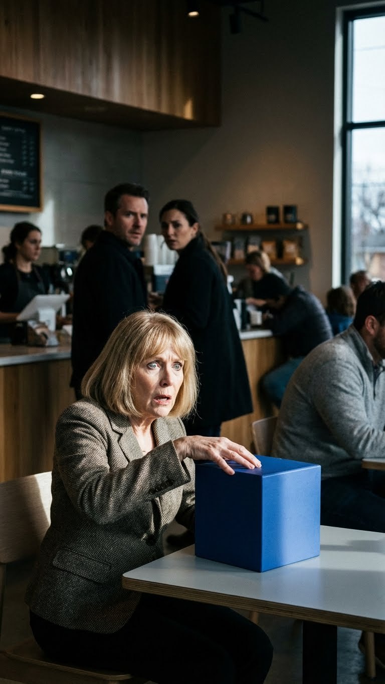 Ik zat met mijn zoon en schoondochter in een café. Terwijl zij gingen afrekenen, zette een vrouw een blauw doosje op mijn tafel en zei: « Dit heb je vanavond nodig. » Voordat ik haar iets kon vragen, was ze alweer verdwenen. Ik stopte het doosje in mijn tas en ging naar huis. Toen ik het eindelijk openmaakte…